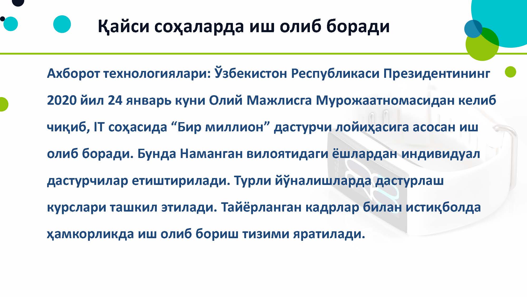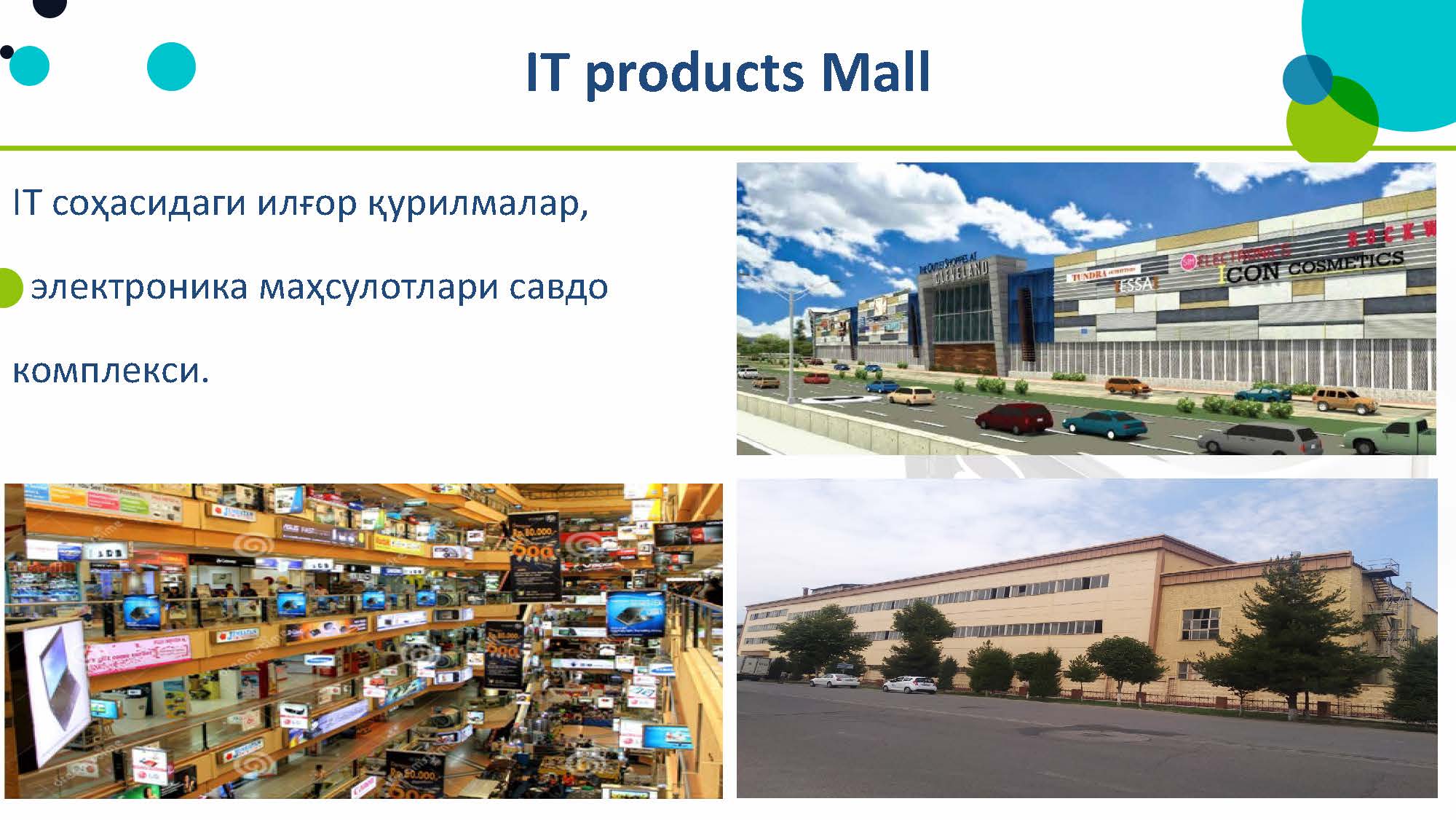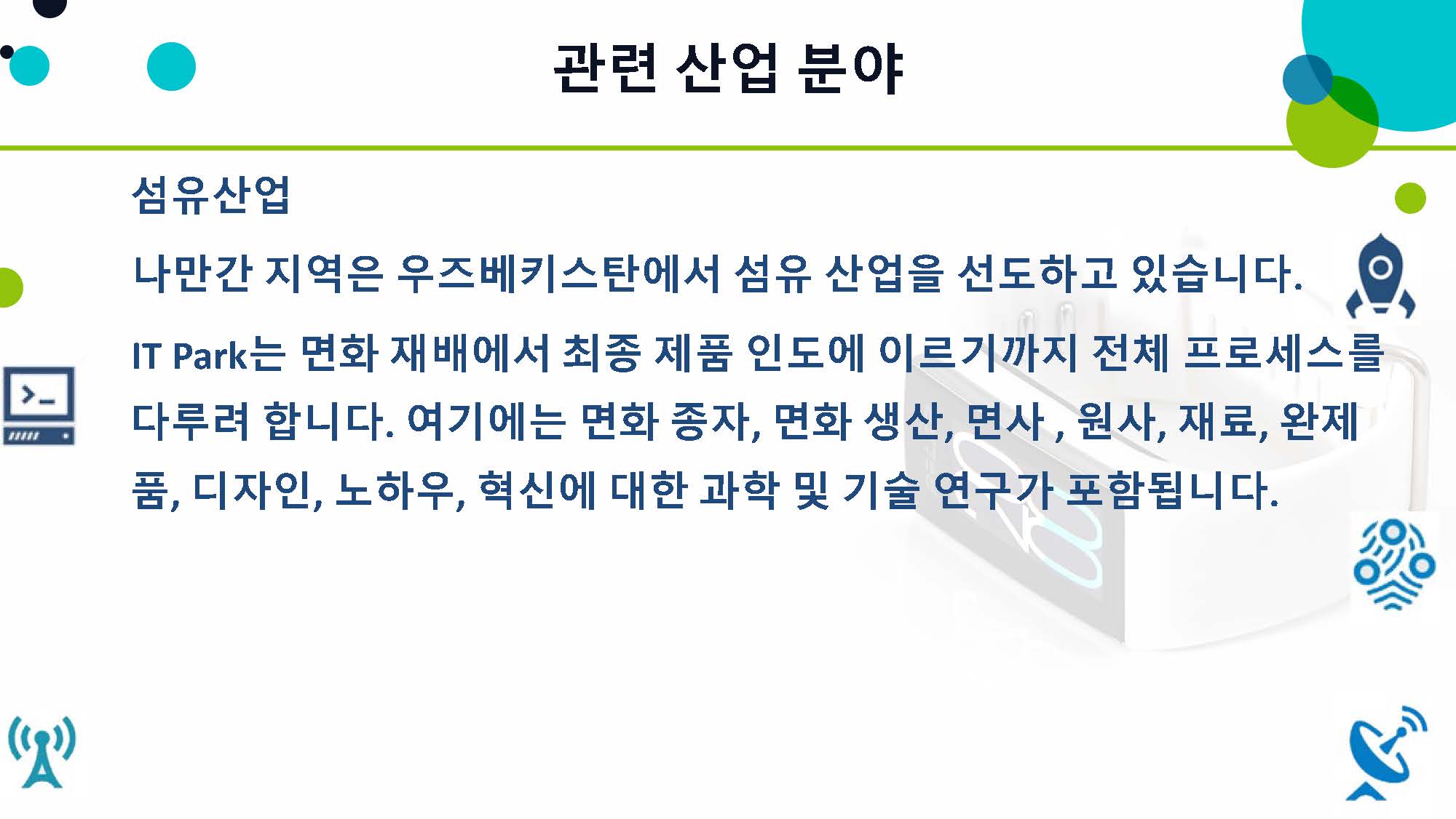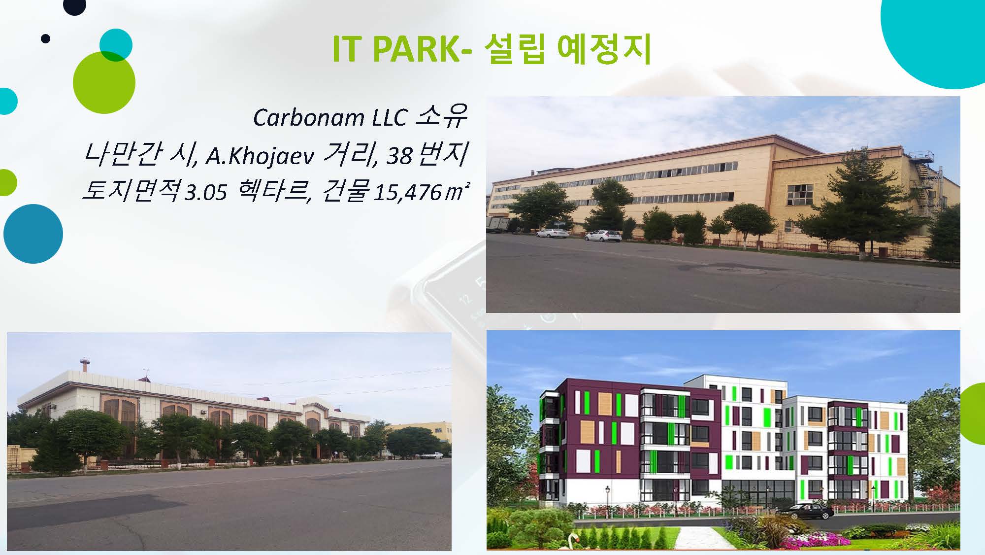 이에 따라 타슈켄트에 있는 'IT Park'를 우즈벡 지방 지역에도 설립하기로 하였는데, 나망간 지역 정부에서도 대통령 지시에 따라 아이티파크 프로젝트를 준비중입니다.