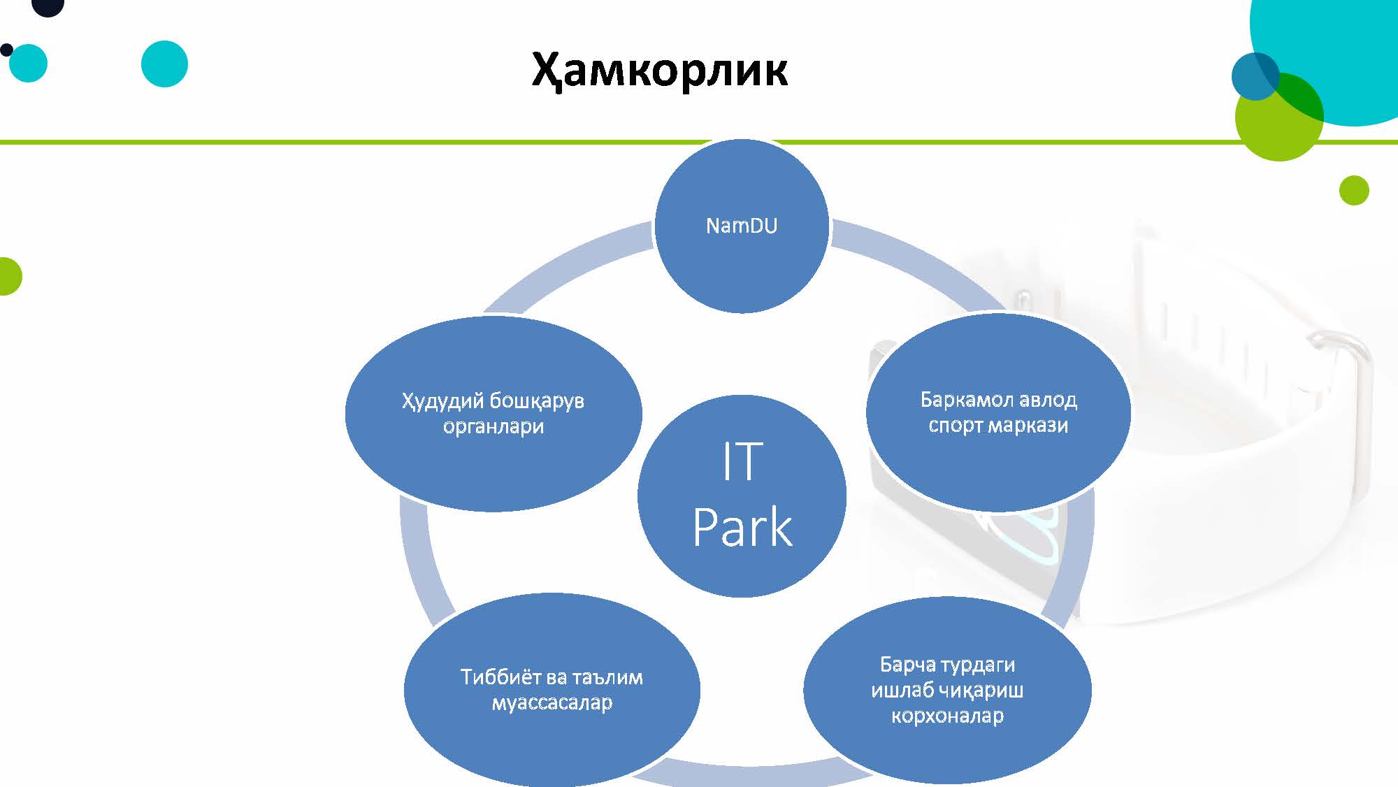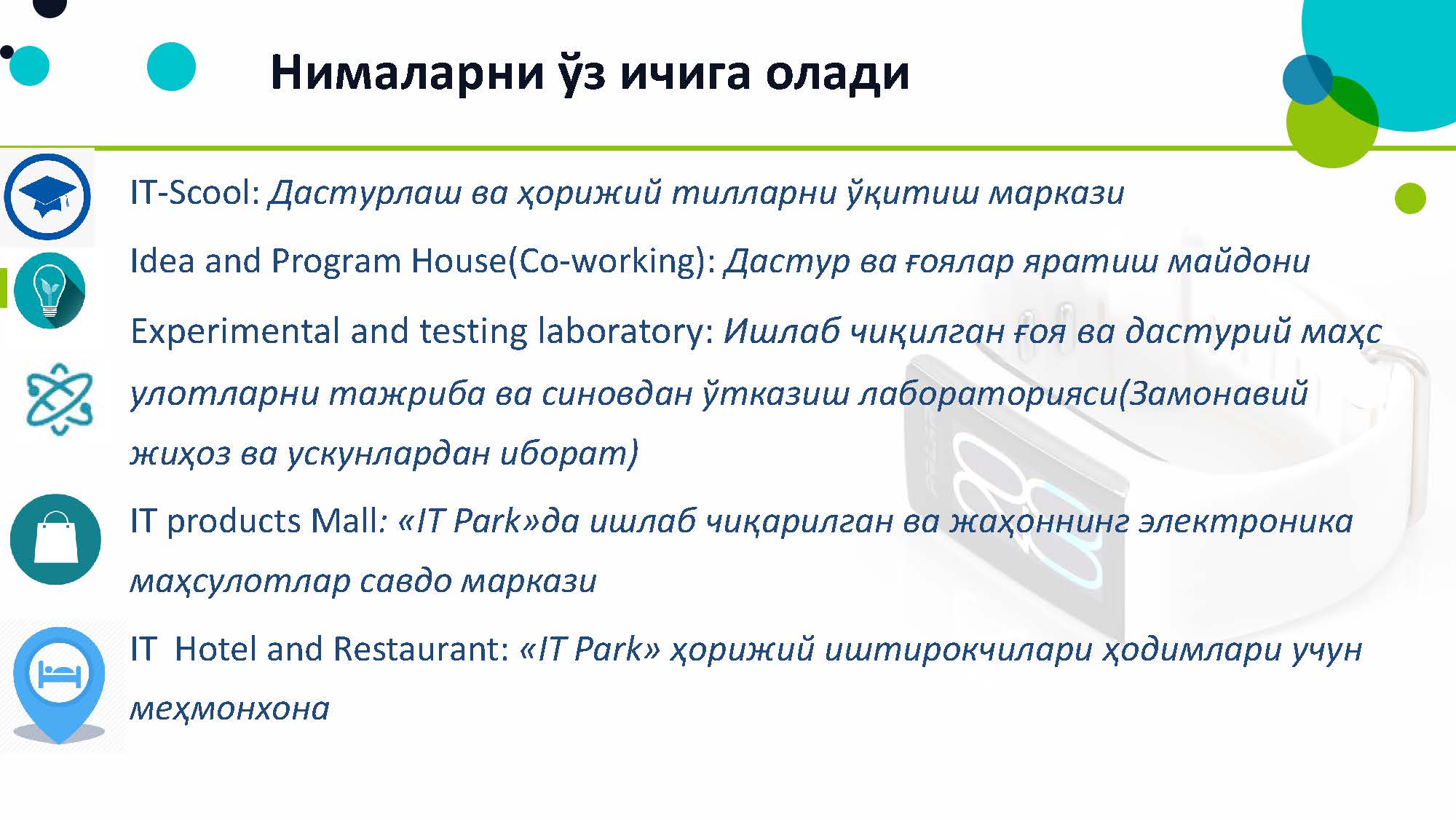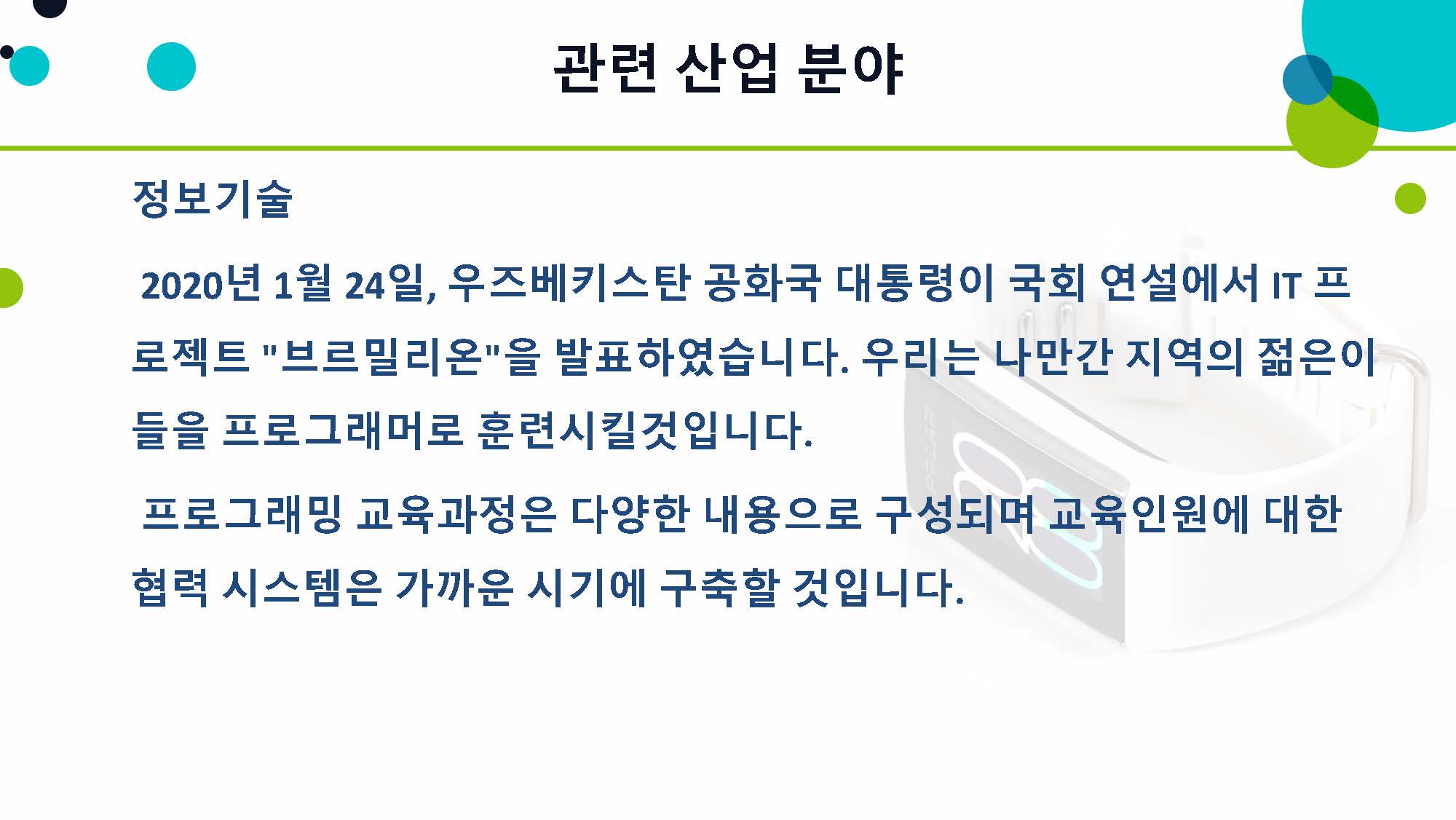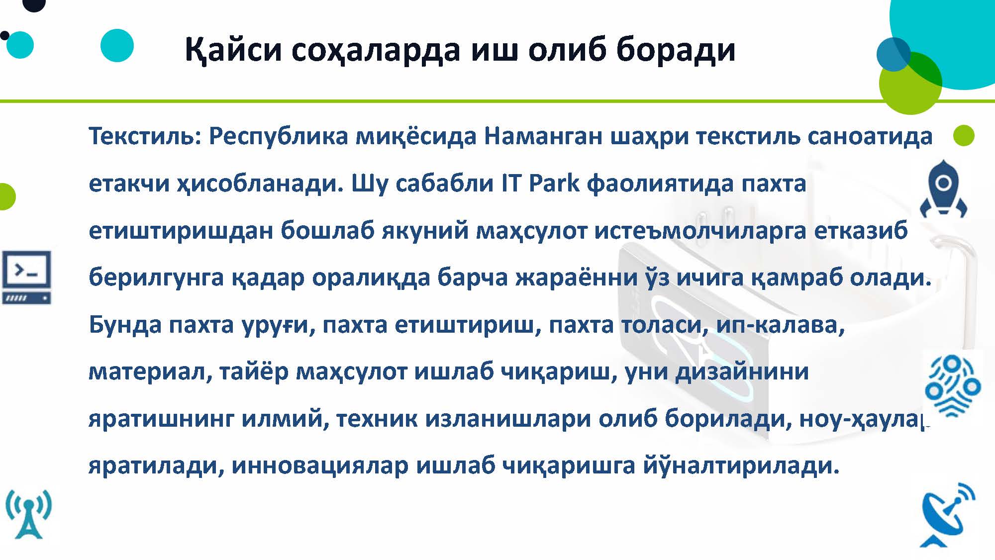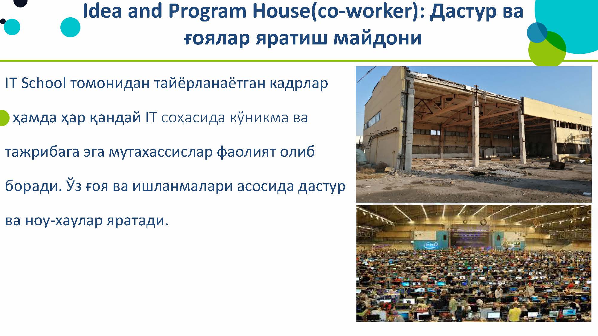 이에 따라 타슈켄트에 있는 'IT Park'를 우즈벡 지방 지역에도 설립하기로 하였는데, 나망간 지역 정부에서도 대통령 지시에 따라 아이티파크 프로젝트를 준비중입니다.