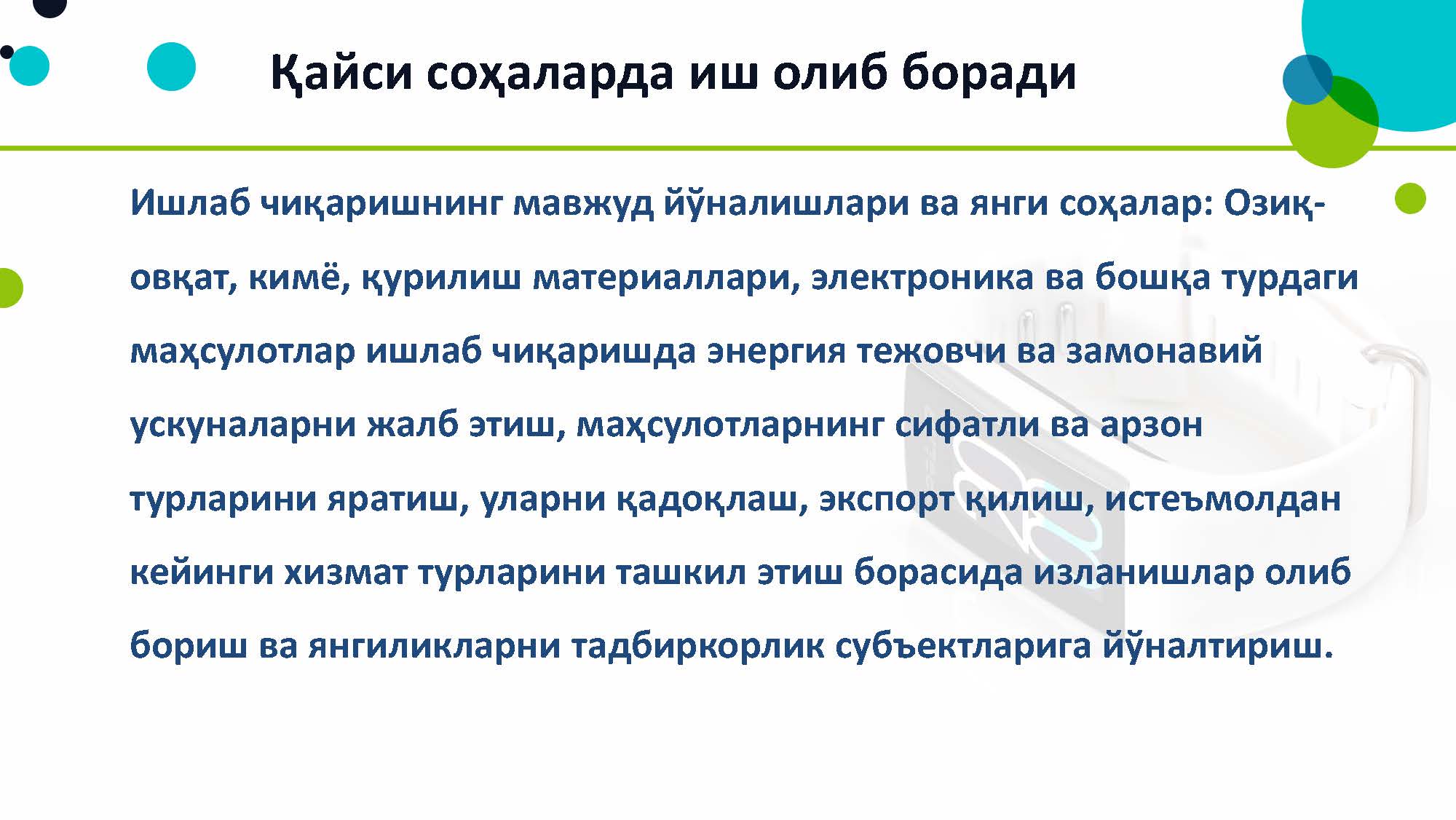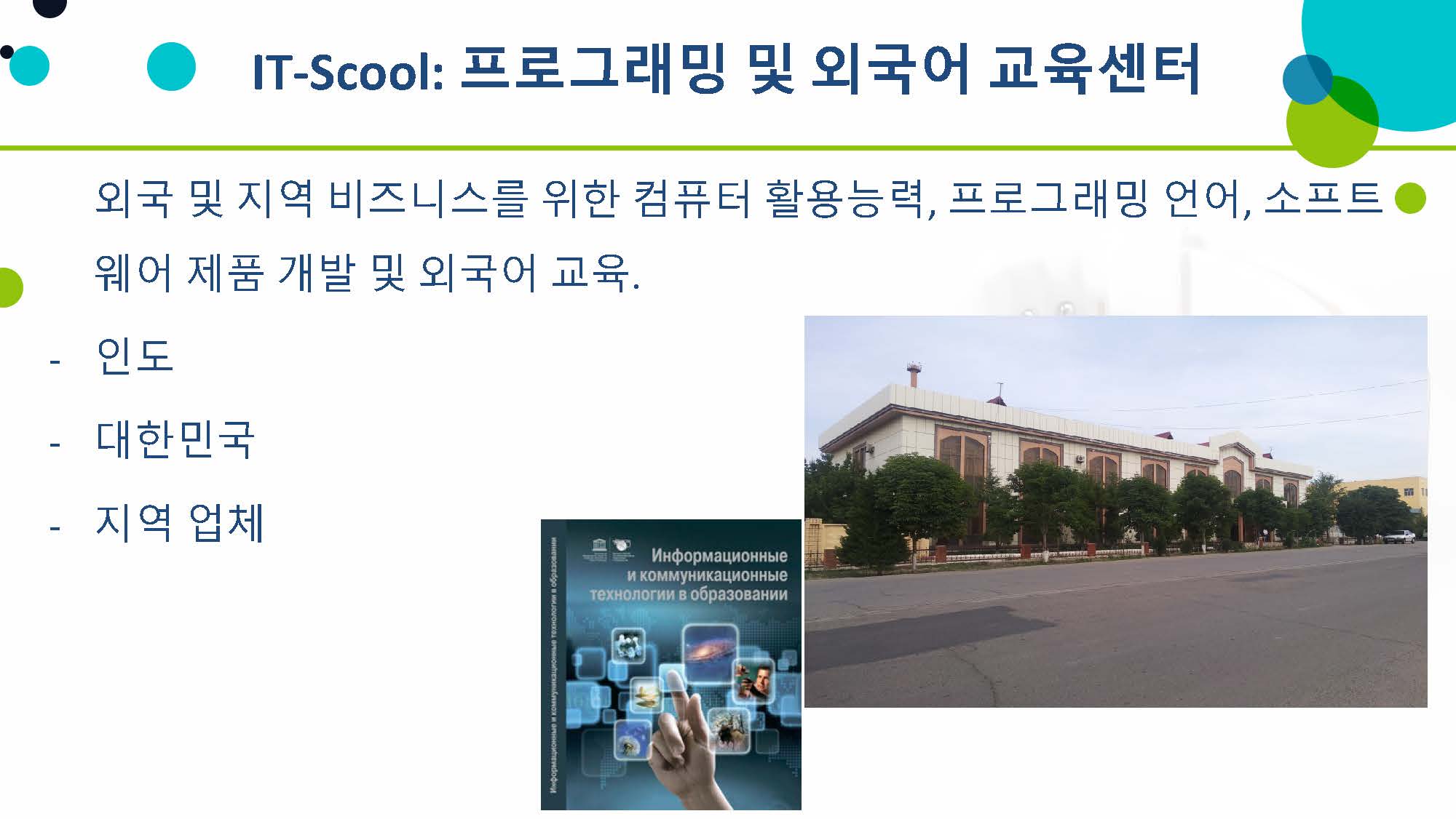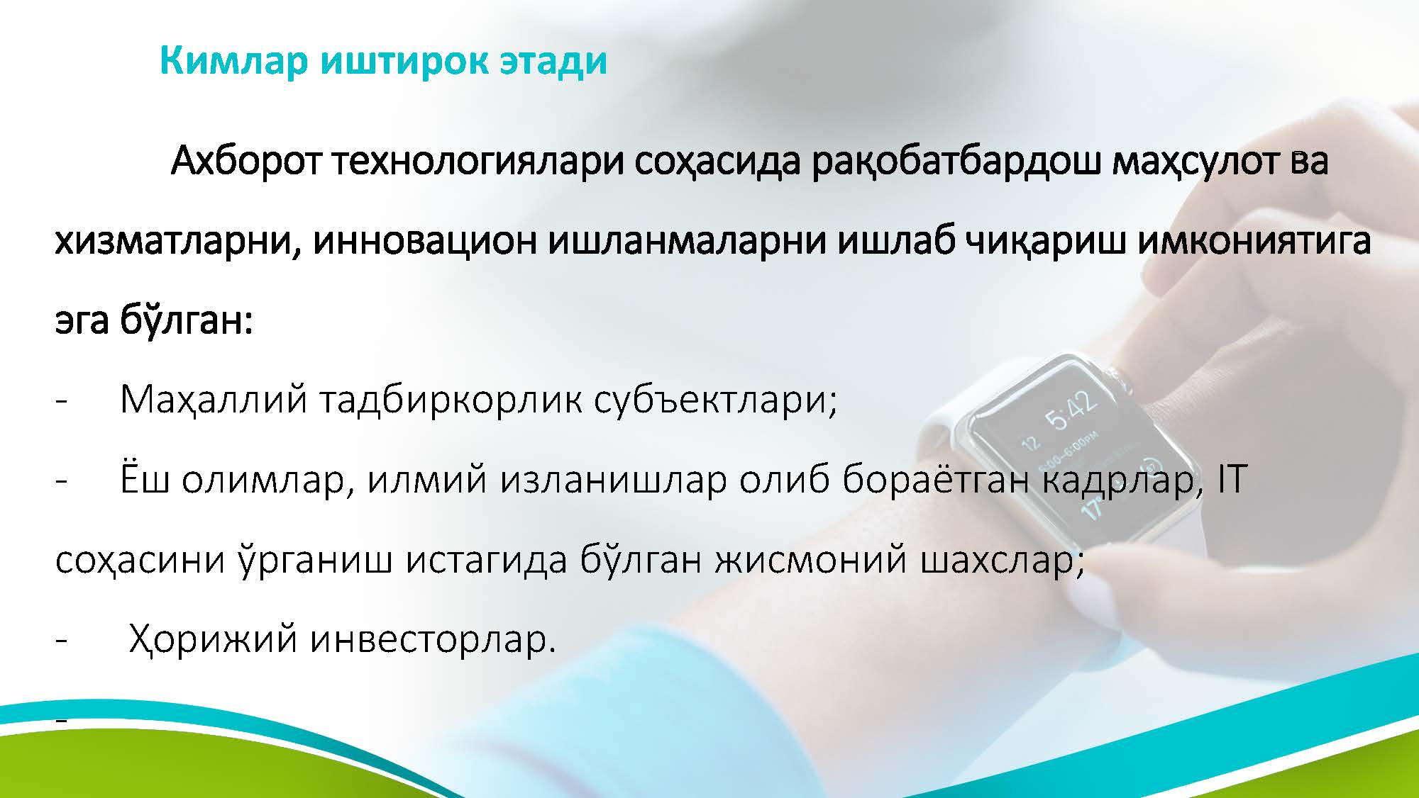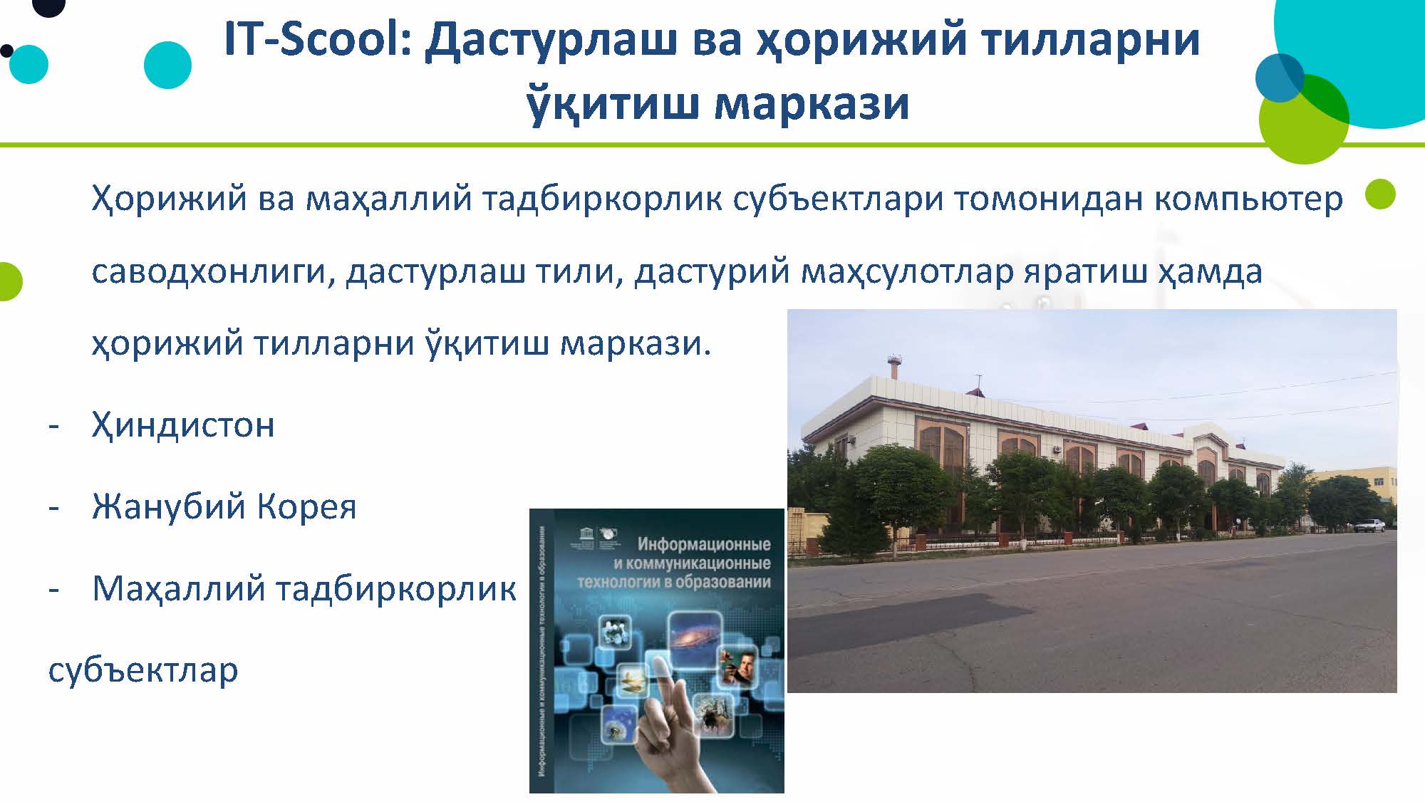 이에 따라 타슈켄트에 있는 'IT Park'를 우즈벡 지방 지역에도 설립하기로 하였는데, 나망간 지역 정부에서도 대통령 지시에 따라 아이티파크 프로젝트를 준비중입니다.