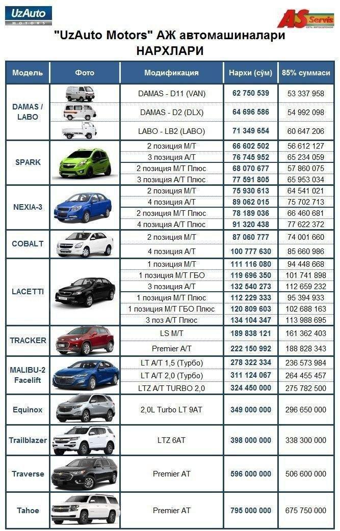 2020년도 2월 기준 우즈베키스탄 쉐보레 신차 차량가격입니다.
