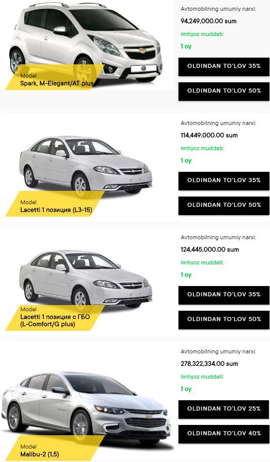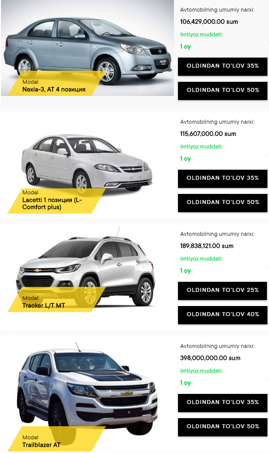 현재 우즈아브토사낫(UzAuto Motors)의 쉐보레 차량만 대출이 가능합니다.