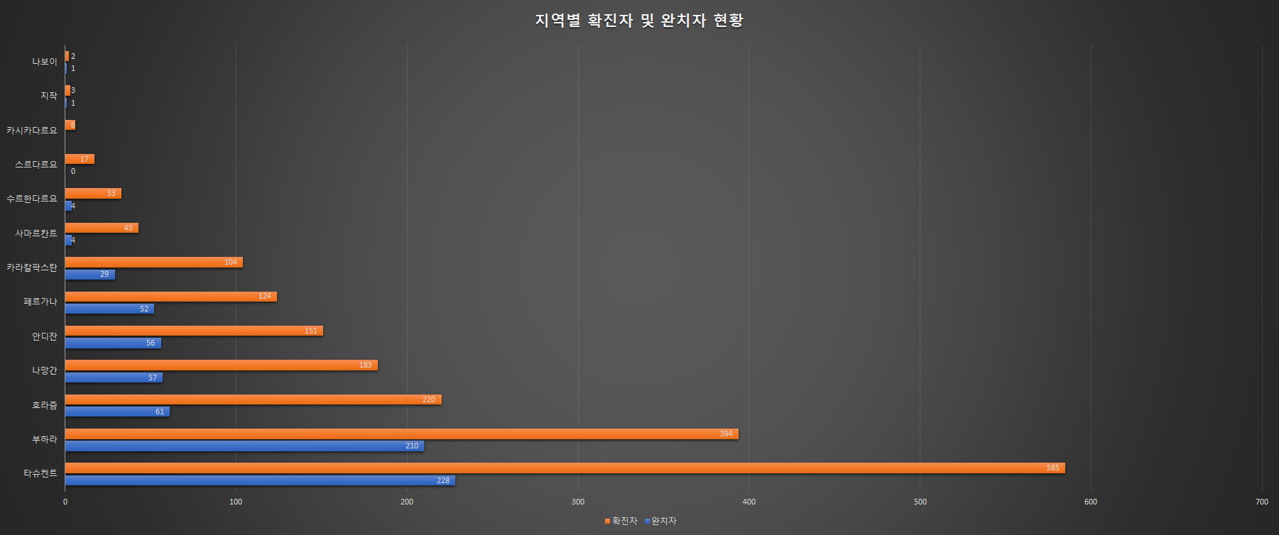 4월 26일 15시 기준 우즈벡 보건부 전염병관리센타에서 발표한 우즈베키스탄 지역별 코로나 바이러스 확진자와 완치자 현황입니다.