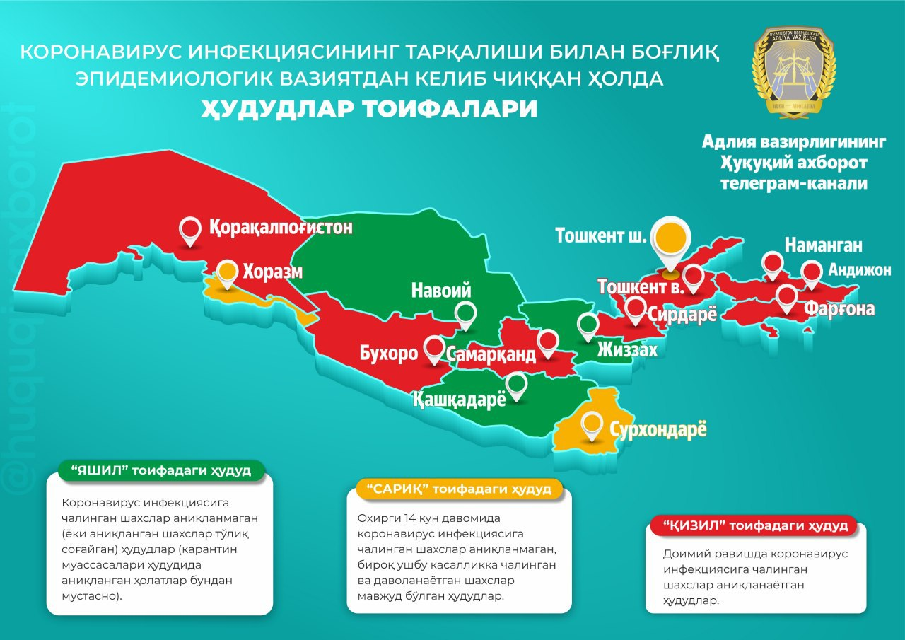 5월5일 회의에서 샤브캇 미르지요예프 대통령은 지역별로 감염자수에 따라 3가지 색상(적색, 황색, 녹색)로 구분하라는 지시를 내렸습니다.
