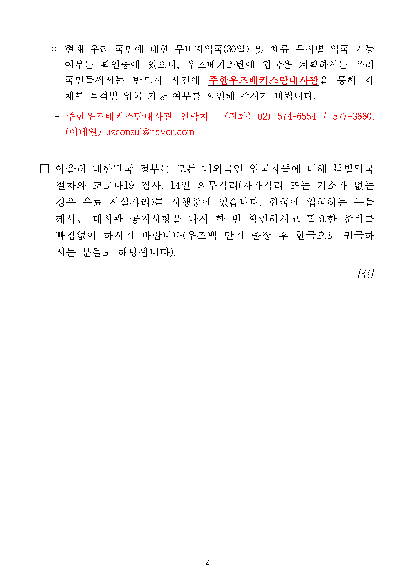 녹색국가인 일본, 한국, 중국, 이스라엘에서 우즈벡으로 입국하는자는 격리의무가 면제된다.