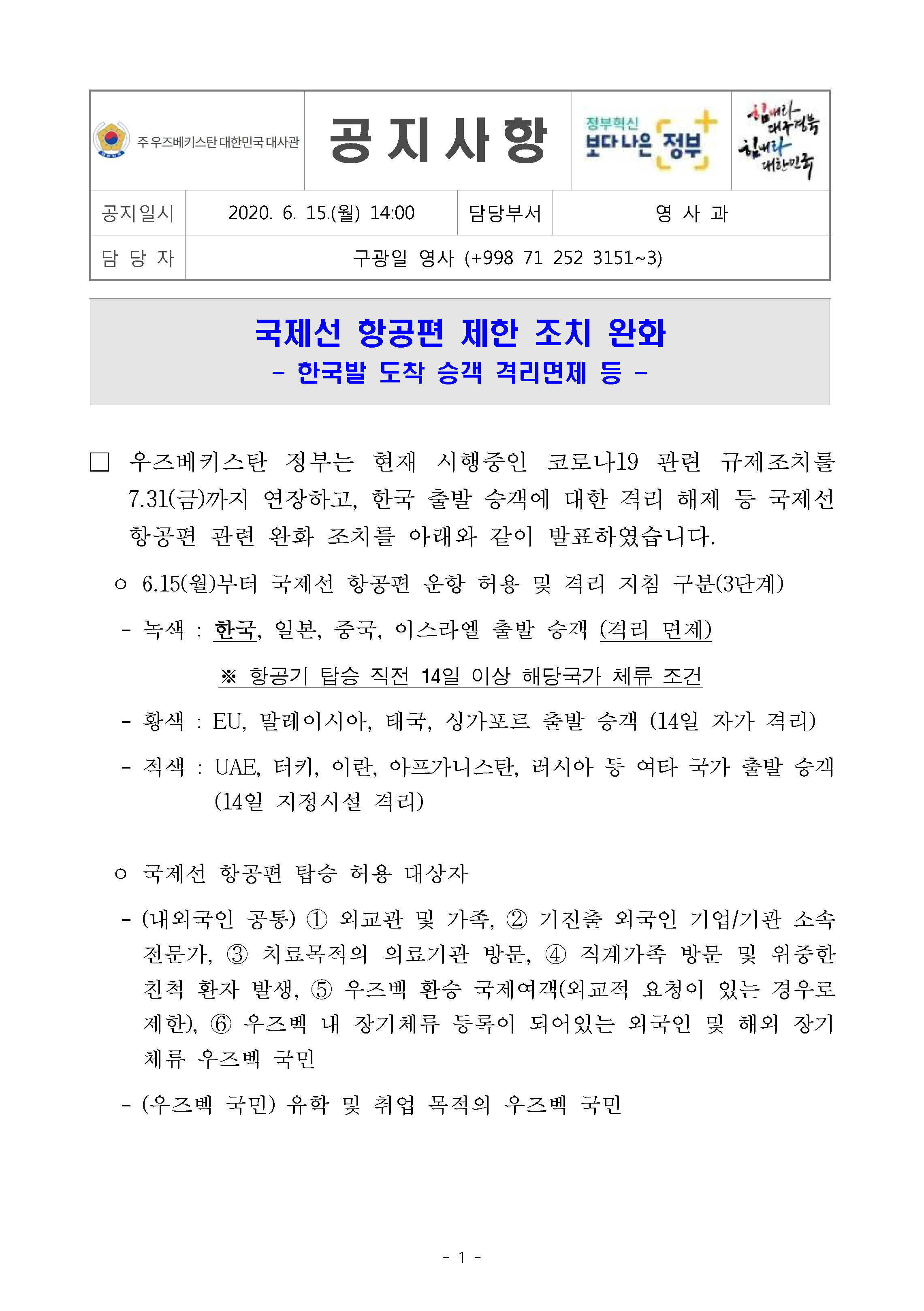 | 우즈베키스탄-대한민국행 항공기 탑승객 제한 조치 (0) | 2020.07.18 |