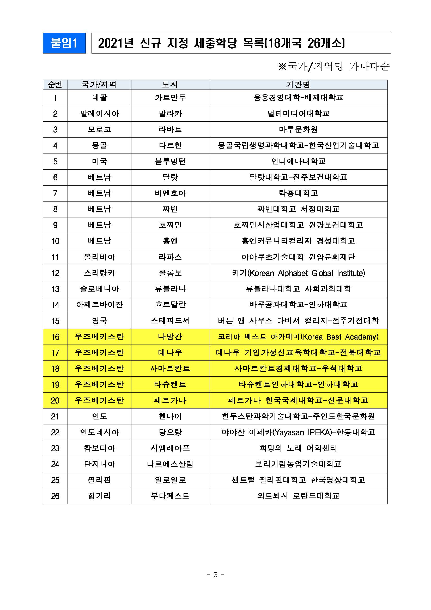 우즈베키스탄에서 세종학당 5개소가 추가로 지정되었다.