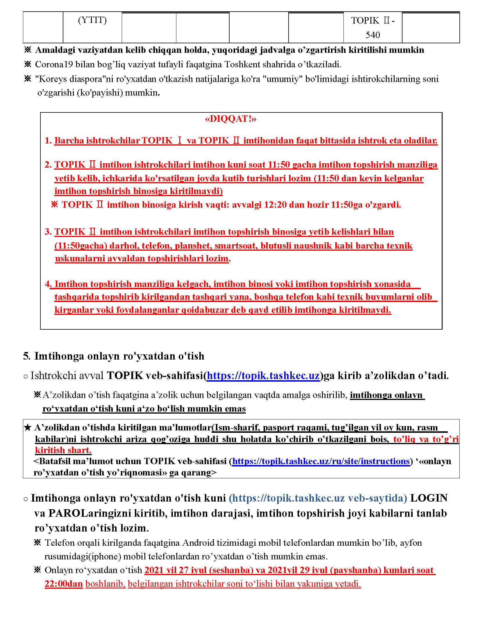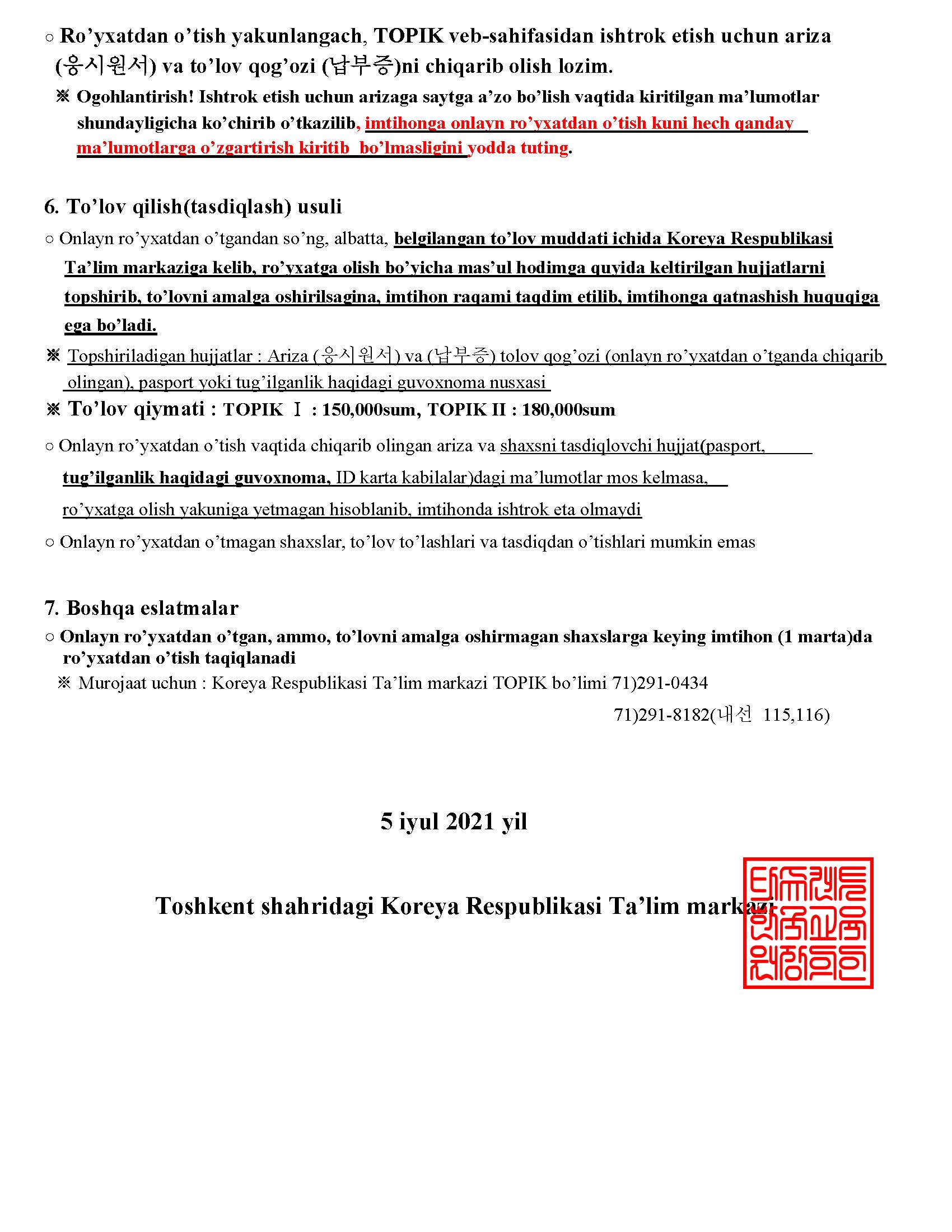 | 한국어능력시험(TOPIK) 부정행위 처리 강화 조치 안내 (0) | 2021.07.06 |