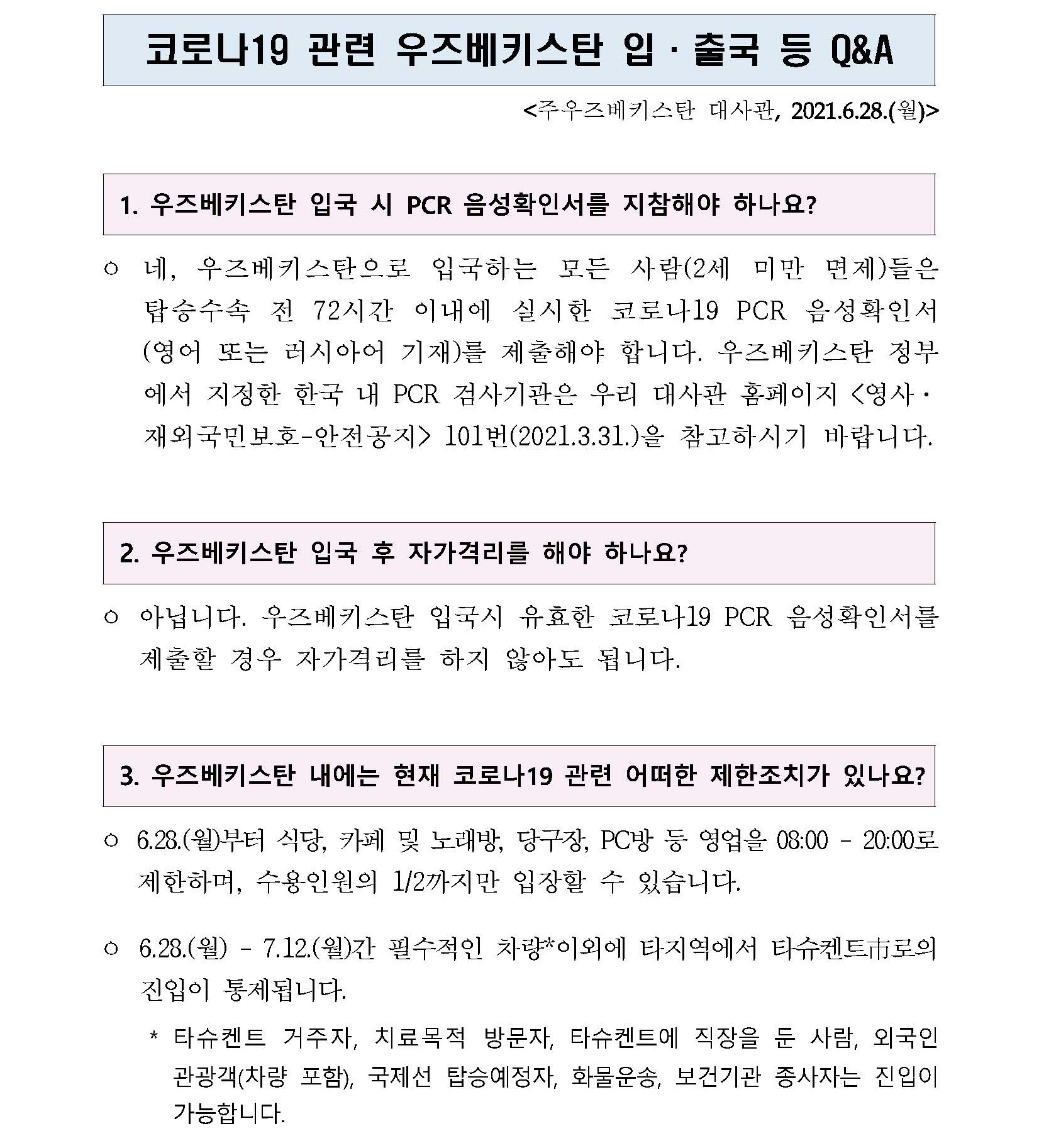 코로나19 관련 우즈베키스탄 입·출국 등 Q&A 상세보기|안전공지주 우즈베키스탄 대한민국 대사관