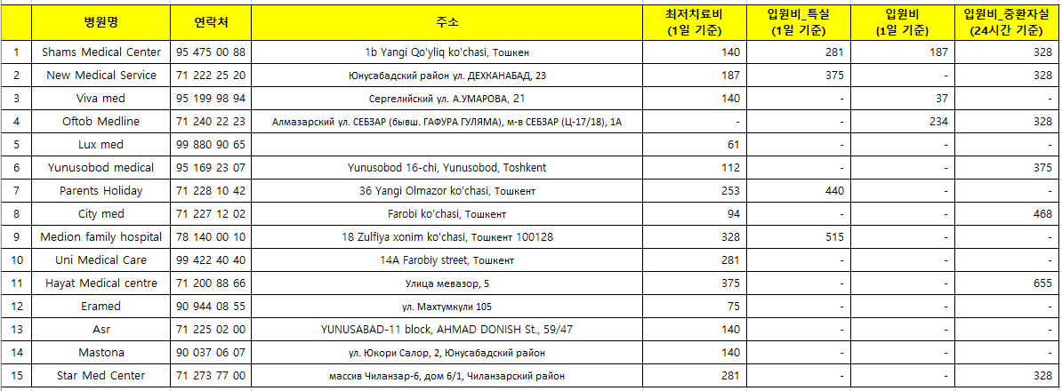 다음은 타슈켄트 현지 COVID 치료가 가능한 민간병원과 치료비 목록이다. (치료비는 미화 기준)